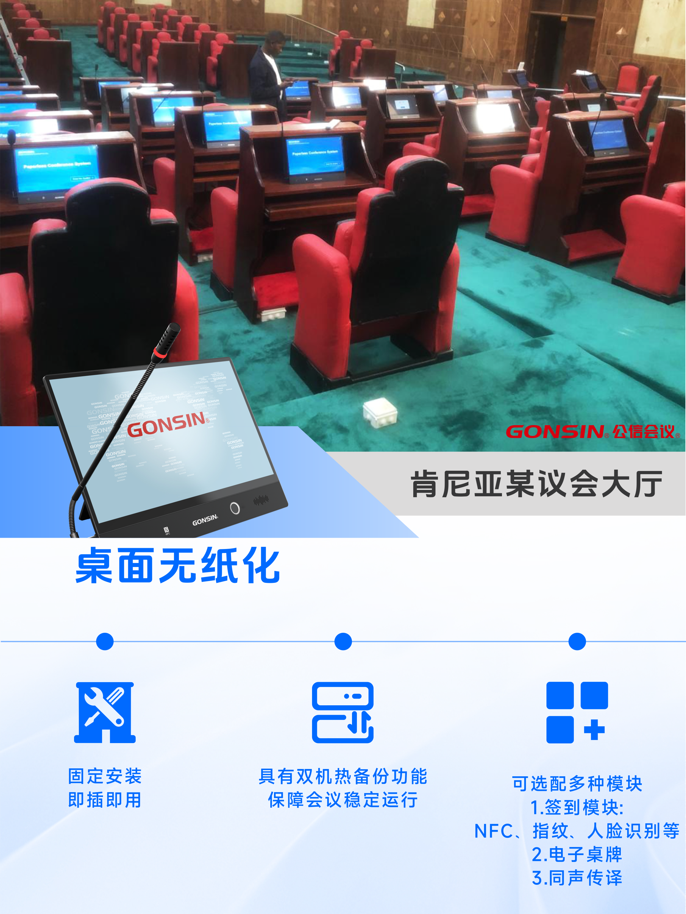 在肯尼亚某议会大厅,公信会议为当地政府设计的桌面无纸化整体项目成功落地,为议会大厅的议事流程带来了高效便捷的体验,肯尼亚政务会议模式向智能化转型持续迈进