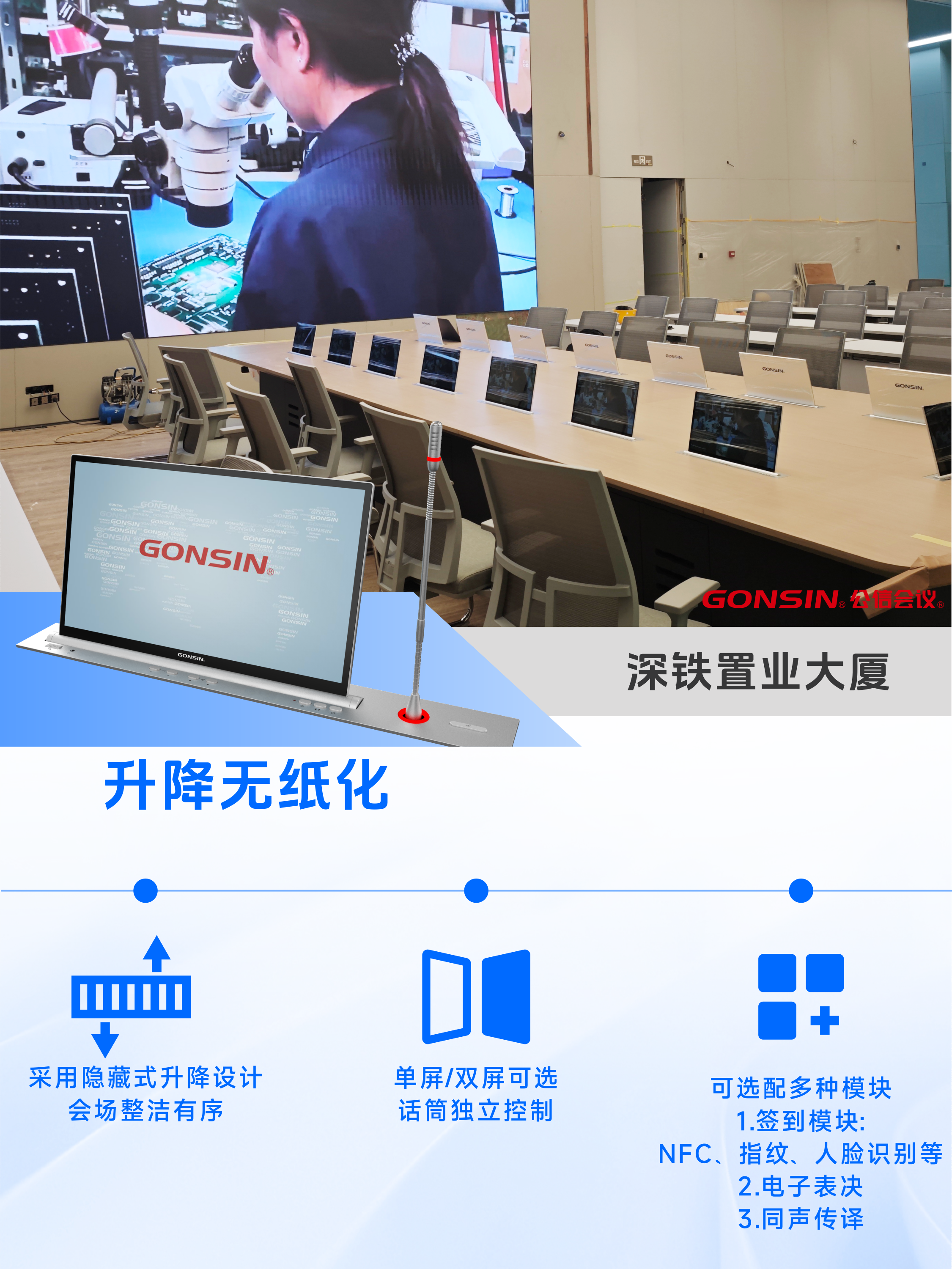 在深铁置业大厦项目中,应用了公信升降无纸化产品,该系统支持模块选配与客制化服务,性能稳定可靠,进一步推动了办公场景的数字化转型