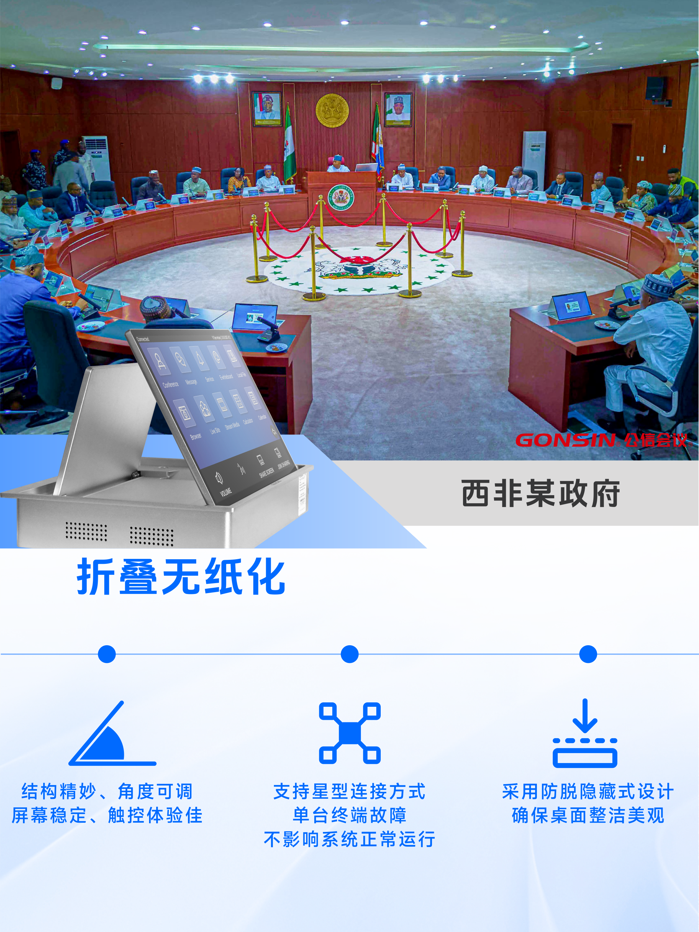 西非某政府项目中,选用了公信会议折叠无纸化。采用双屏物理折叠,前屏可显示并触摸操作,背屏为电子桌牌,与会人员可根据自身观看需求,手动调整屏幕的最佳观看角度,精巧的结构设计,保证操作时屏幕稳定无抖动,充分满足政府会议对设备智能化及实用性的双重要求