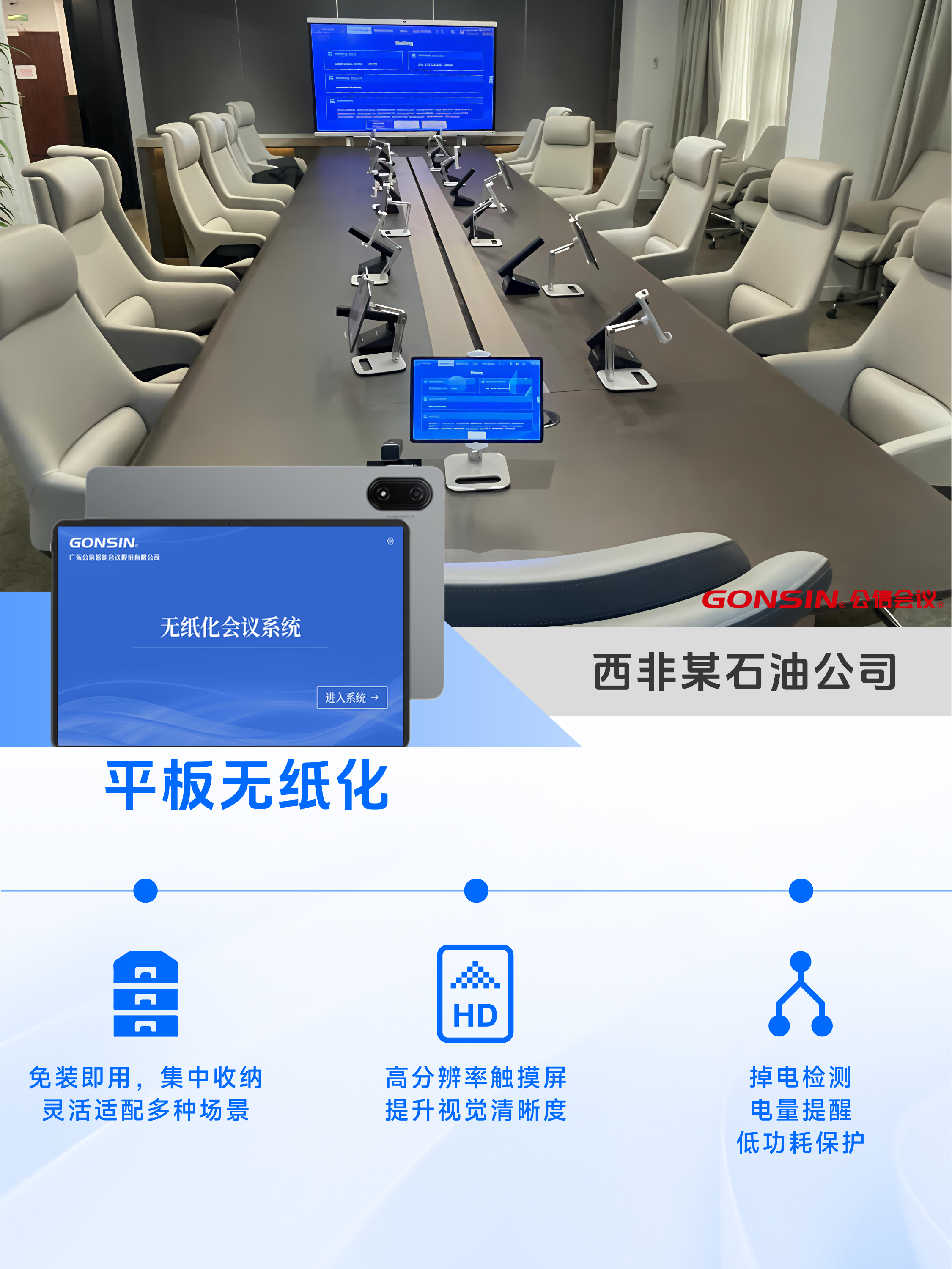 西非某石油公司引入了公信会议平板无纸化 会议发言,设备使用、移动、收纳灵活便捷,适配不同会议场景,为企业的高效会议提供助力