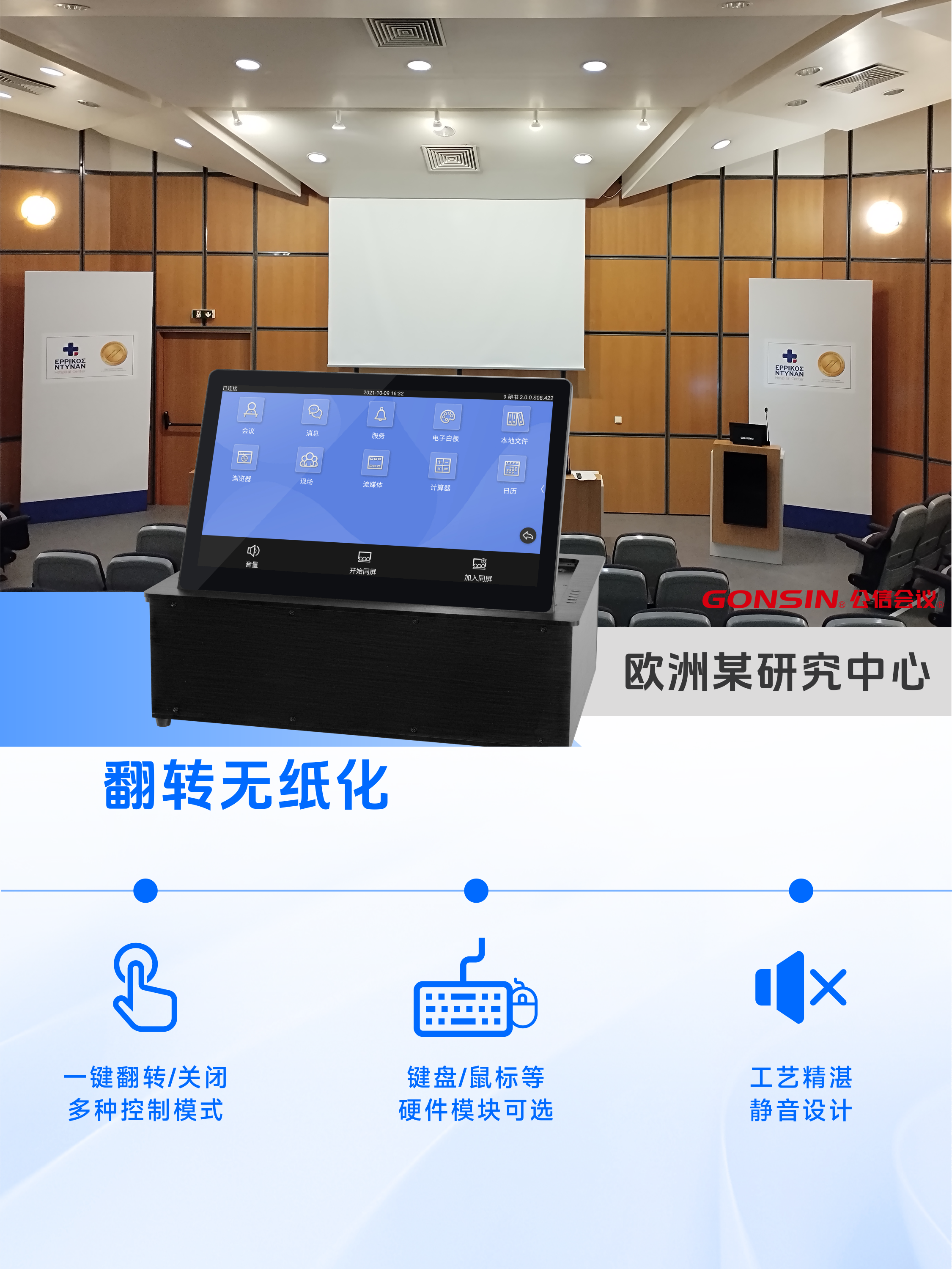 欧洲某研究中心采用翻转无纸化系统,支持一键翻转/关闭操作,极大提升设备使用的便捷性。产品采用静音设计,设备快速运行,对参会人员无噪音干扰,为会议协作提供了稳定、高效的设备支撑